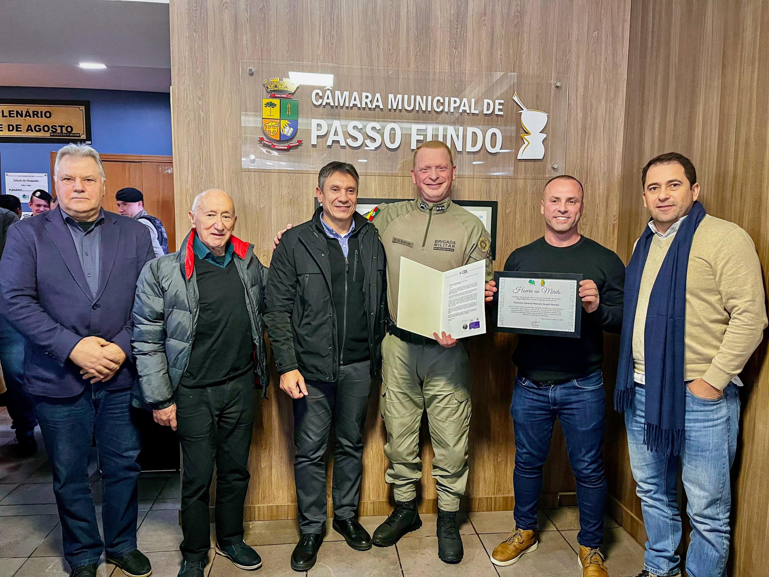 A CDL Passo Fundo e o CONSEPRO participaram, na quarta-feira (02), da cerimônia de entrega do título de Honra ao Mérito ao tenente-coronel Marcelo Scapin Rovani, comandante do 3º RPMon da Brigada Militar. A homenagem, concedida pela Câmara de Vereadores de Passo Fundo por proposição do vereador Diego Milani, reconheceu a trajetória exemplar do oficial na segurança pública do Estado.