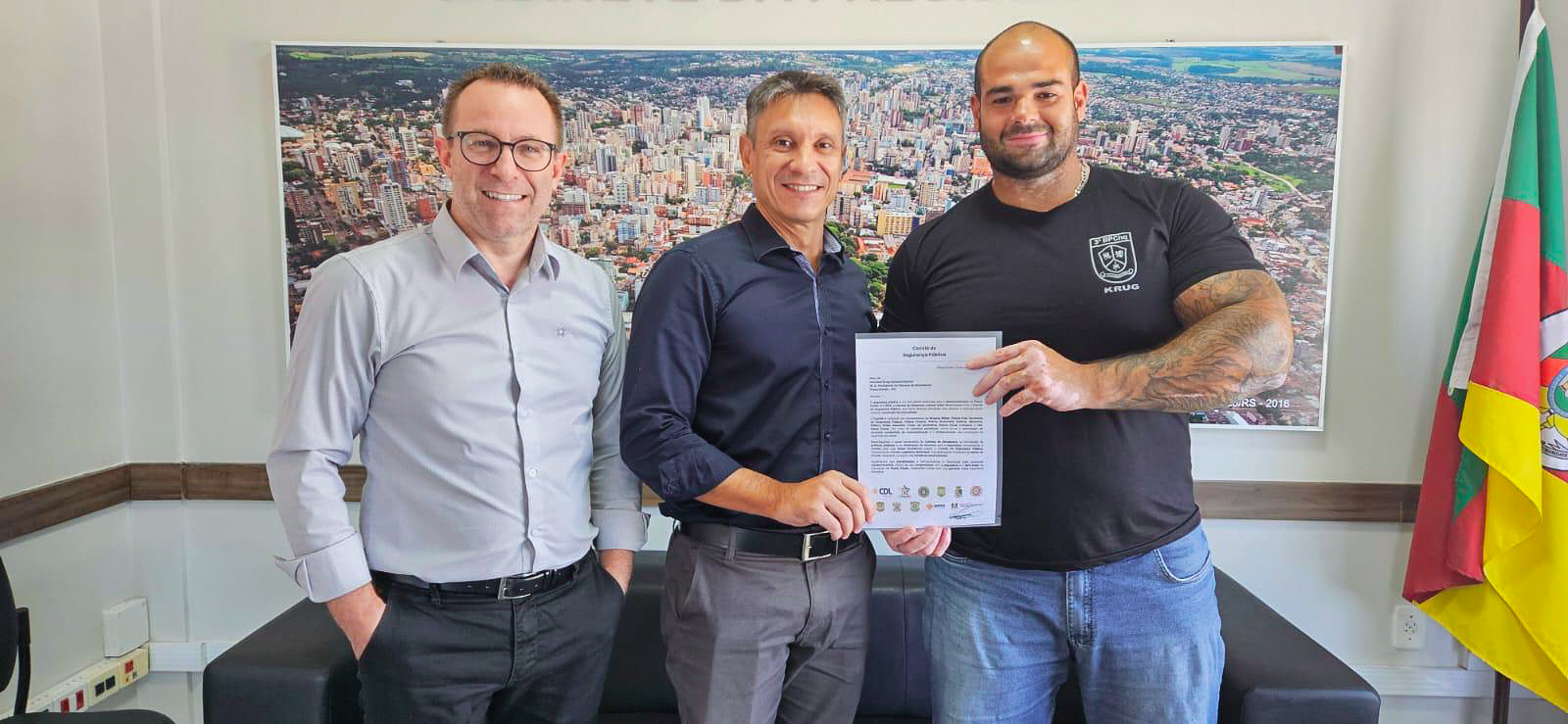 Nesta quarta-feira (19), o Comitê de Segurança Pública de Passo Fundo formalizou o convite para que o presidente da Câmara de Vereadores, Giordani Krug Campos Ramos (Gio Krug) passe a integrar o grupo, representando o Poder Legislativo Municipal. O convite foi entregue pelo presidente da CDL Passo Fundo, Evandro Pereira da Silveira, e pelo diretor executivo Onis Casagrande, destacando a importância da participação da Câmara nas articulações voltadas à segurança da cidade.